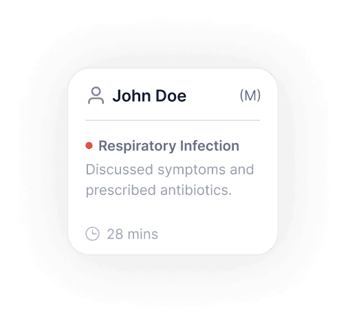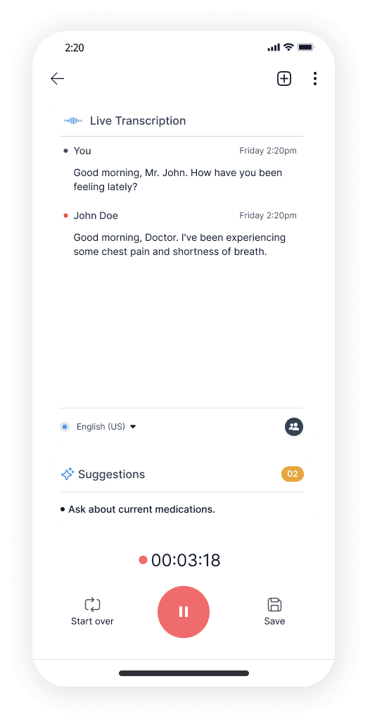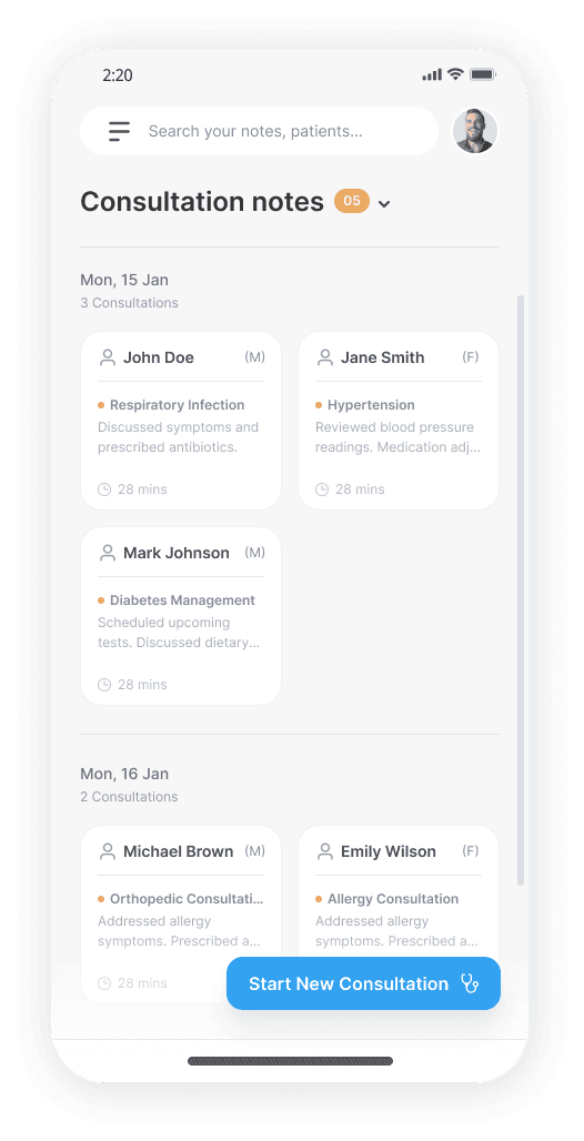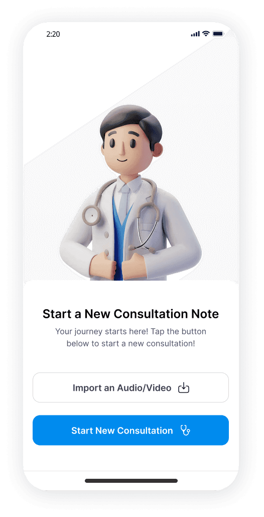 A physician notes app for consultations that records audio, generates AI-driven transcripts, and provides key observations and overviews.