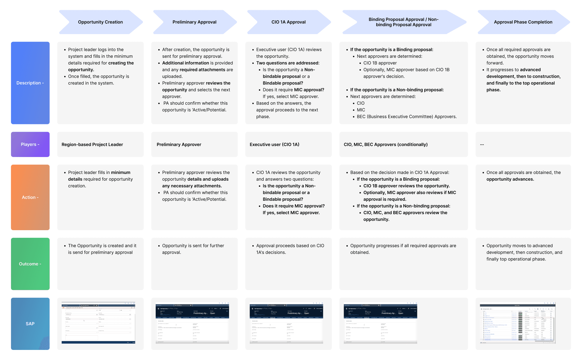 The existing opportunity management process was inconsistent, with varying workflows across different projects. This lack of structure made it difficult to standardize approvals and retrieve key insights from multiple teams. The challenge was to develop a unified approval system that could handle the complexities of large-scale infrastructure projects while simplifying the decision-making process.